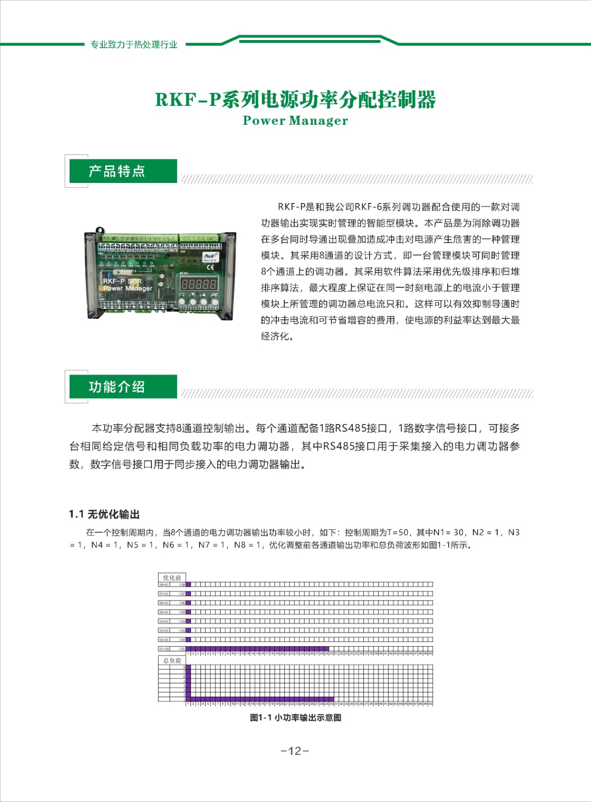 RKF-P是和我公司RKF-6系列調功器配合使用的一款對調功器輸出實現實時管理的智能型模塊。本產品是為消除調功器在多臺同時導通出現疊加造成沖擊對電源產生危害的一種管理模塊。其采用8通道的設計方式,即一臺管理模塊可同時管理8個通道上的調功器。其采用軟件算法采用優先級排序和歸堆排序算法,最大程度上保證在同一時刻電源上的電流小于管理模塊上所管理的調功器總電流只和。這樣可以有效抑制導通時的沖擊電流和可節省增容的費用,使電源的利益率達到最大最經濟化。